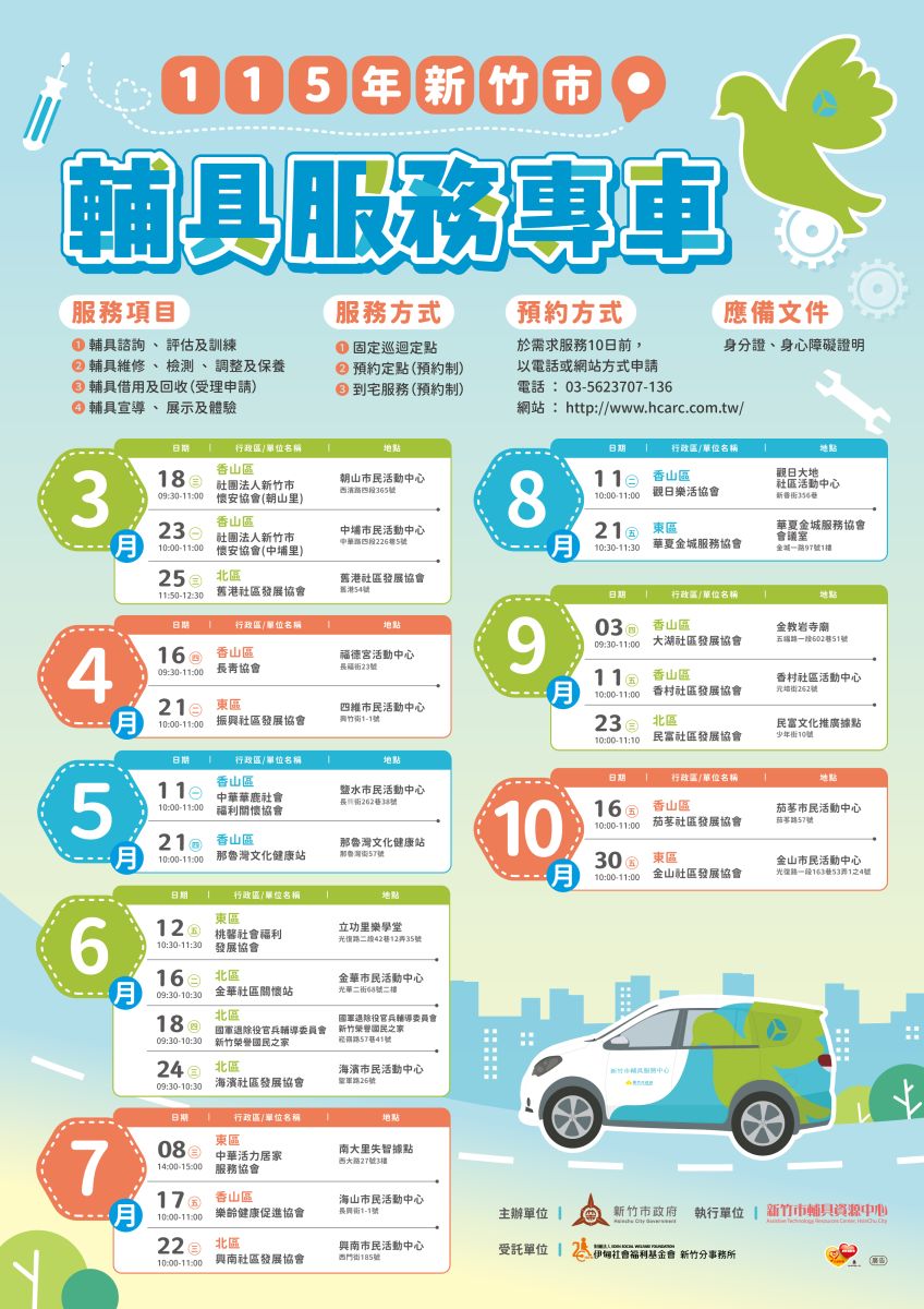 为回应民众需求,新竹市辅具资源中心持续推动「辅具服务专车」,将专业服务带入社区,让有需要的市民朋友在熟悉的生活场域中,就近获得即时协助,减少往返奔波与等待时间,实践「服务零距离」的理念。