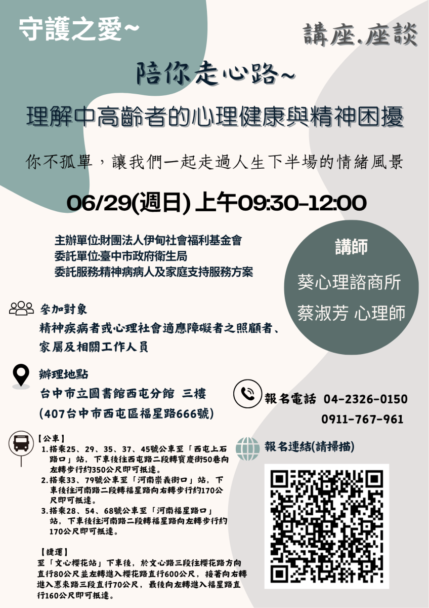 伊甸基金會中區服務中心6月29日(日)上午9:30-12:00將舉辦「陪你走心路 理解中高齡者的心理健康與精神困擾」講座,透過講師的分享,幫助你因應在面臨中高齡生涯階段所帶來的人生課題、衝擊或影響,同時,提供您有關心理健康、精神困擾之知能訊息,以利你面對日常生活的挑戰。