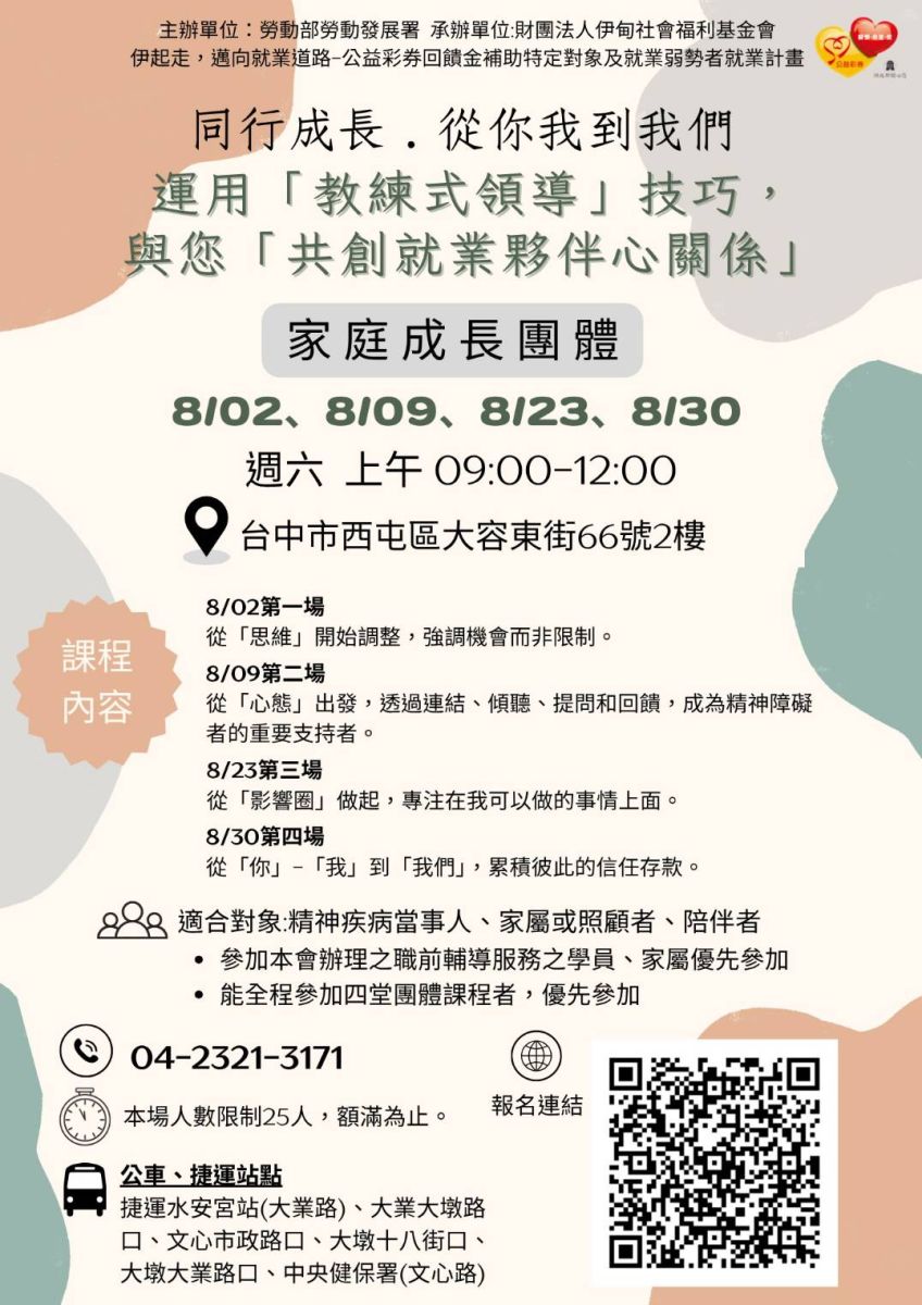 伊甸基金會中區服務中心將舉辦【同行成長,從你我到我們運用「教練式領導」技巧,與您「共創就業夥伴心關係」家庭成長團體】,邀請您一起來認識,透過「教練式領導」的核心技巧,陪伴您一起從思維、心態、行動到關係連結,培養陪伴者的支持力、溝通力與信任建立力,與精神疾病當事人共創穩定、合作、具成長性的就業關係。