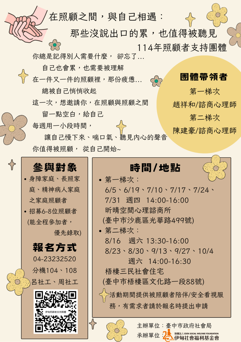 伊甸基金會中區服務中心將舉辦「在照顧之間,與自己相遇:那些沒說出口的累,也值得被聽見」照顧者支持團體,這一次,想邀請你,在照顧與照顧之間,留一點空白,給自己,每週用一小段時間,讓自己慢下來、喘口氣、聽見內心的聲音,你值得被照顧,從自己開始◦