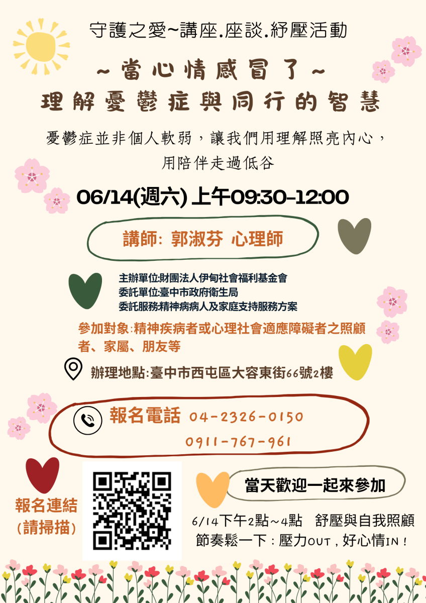 伊甸基金會中區服務中心6月14日(六)上午9:30-12:00將舉辦「當心情感冒了~理解憂鬱症與同行的智慧」講座,期待透過講師的分享,提供您有關心理健康、精神困擾的知能訊息,幫助您理解自己或家人、朋友的憂鬱處境,接納與照顧自己或陪伴支持他們面對日常生活的挑戰。