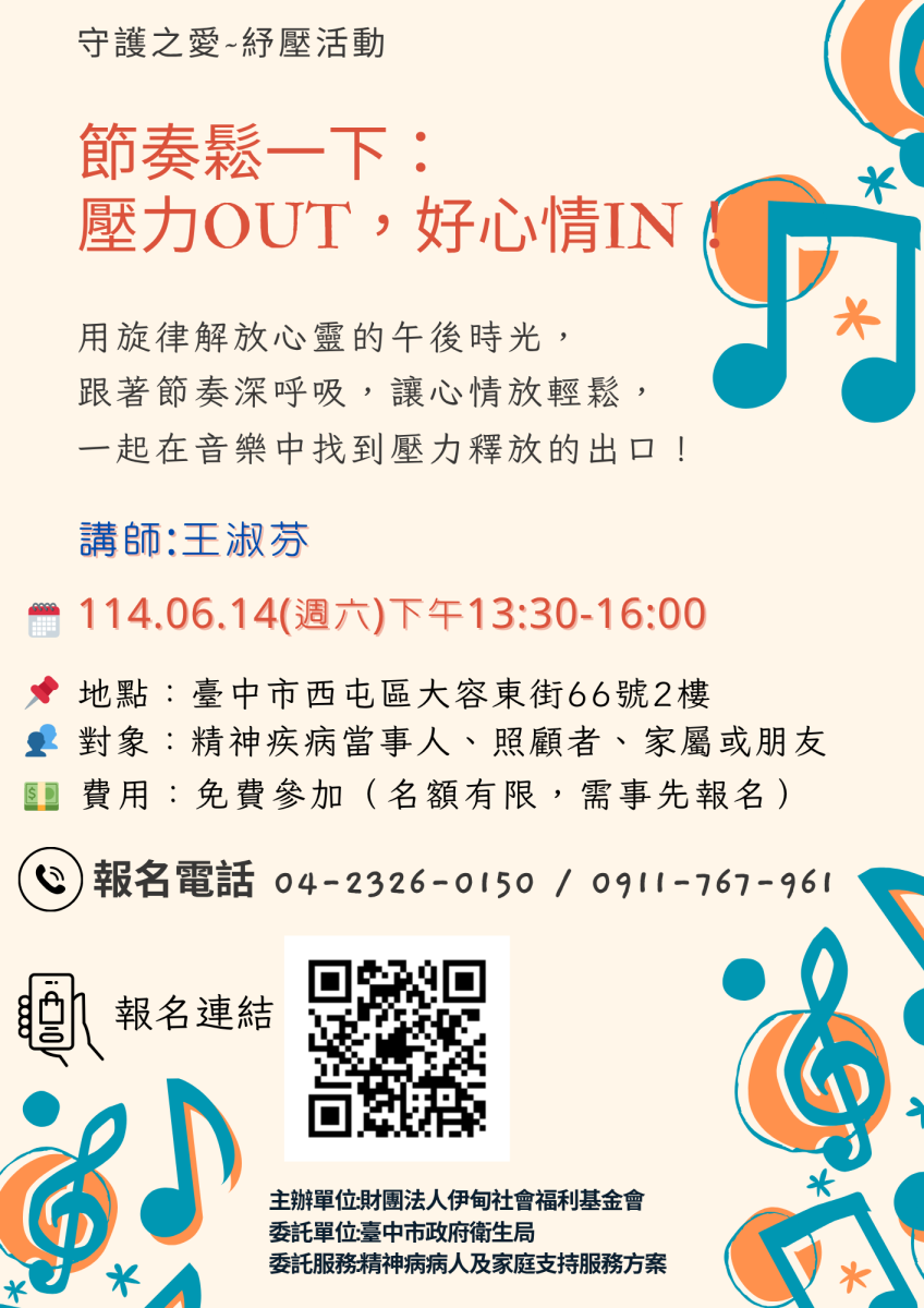 在快速的生活節奏中,壓力如影隨形。伊甸基金會中區服務中心6月14日(六)下午13:30-16:00將舉辦「節奏鬆一下:壓力OUT,好心情IN」紓壓活動,這場音樂與放鬆的活動,將帶領您用聲音與節奏,釋放內在的緊繃情緒,重新找回與自己對話的空間,不需要會樂器,只需要您的一雙耳朵與一顆願意放鬆的心。