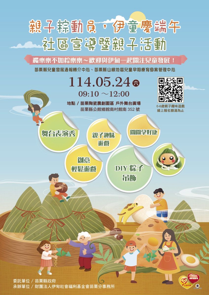 伊甸基金會苗栗服務中心將於5月24日(六)9:10–12:00在苗栗陶瓷農創園區(苗栗縣公館鄉館南352號)舉辦「親子粽動員  伊童慶端午」活動。現場將有舞台表演、親子趣味遊戲、DIY、闖關活動、創意輕鬆遊戲、攤位宣導等豐富精彩的內容,歡迎與伊甸一起「粽」動員,關注兒童發展,提前歡慶美好的端午佳節。